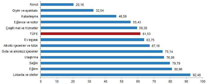 Bir önceki yılın aynı ayına göre en az artış gösteren ana grup yüzde 20,16 ile konut oldu. Buna karşılık, bir önceki yılın aynı ayına göre artışın en yüksek olduğu ana grup ise yüzde 92,48 ile lokanta ve oteller oldu.