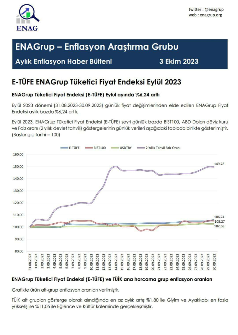 Öte yandan bağımsız araştırma grubu ENAGrup Tüketici Fiyat Endeksi (E-TÜFE) Eylül ayında yüzde 6,24 artarken, E-TÜFE’nin son 12 aylık artışı yüzde 130,13 olarak gerçekleşti. ENAG verilerine göre 2023 yılı, Ocak-Eylül dönemi enflasyon oranı ise yüzde 95,33 oldu.