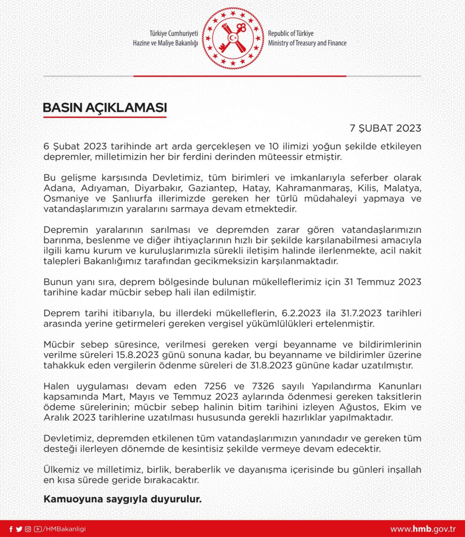 Adana, Adıyaman, Diyarbakır, Gaziantep, Hatay, Kahramanmaraş, Kilis, Malatya, Osmaniye ve Şanlıurfa'da gereken her türlü müdahaleyi yapmaya ve vatandaşların yaralarını sarmaya devam edildiğine dikkati çekilen açıklamada, deprem bölgesinde bulunan mükellefler için 31 Temmuz 2023 tarihine kadar mücbir sebep hali ilan edildiği duyuruldu.