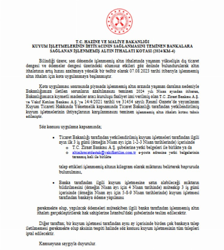 Hazine ve Maliye Bakanlığı, Ziraat Bankası ve Vakıf Katılım Bankası'na yetkilendirilmiş kuyum işletmelerinin ihtiyaçlarının karşılanmasını teminen işlenmemiş altın ithalatı kotası tahsis etti.