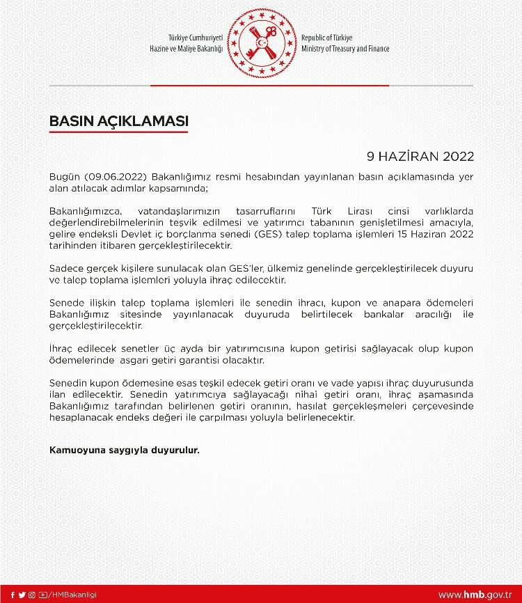Hazine ve Maliye Bakanlığı, gelire endeksli devlet iç borçlanma senedi toplama işlemlerinin 15 Haziran tarihinden itibaren gerçekleşeceğini duyurdu.