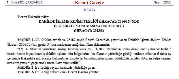 İZMİR (İGFA)- 11 Ekim 2023 tarihli Resmî Gazete’de yer alan Dahilde İşleme Rejimi Tebliği'nde Değişiklik Yapılmasına Dair Tebliğle; 1 Ocak 2020 ile 11 Ekim 2023 arasında düzenlenmiş, ihracat taahhüt hesabı henüz kapatılmamış dahilde işleme izin belgelerine, 6 ay içinde Ticaret Bakanlığı'na müracaatta bulunulması şartıyla başvurunun uygun görüldüğü tarihten itibaren belge orijinal süresinin yarısını geçmemek üzere ek süre verilecek.