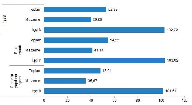 Bir önceki aya göre malzeme endeksi yüze 1,37, işçilik endeksi yüzde 0,18 artarken, bir önceki yılın aynı ayına göre malzeme endeksi ise yüzde 39,80, işçilik endeksi de yüze 102,72 arttı.