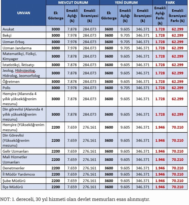 Örneğin; Temmuz ayı itibariyle birinci derecedeki 3000 ek göstergeli öğretmen, sağlık çalışanı, din görevlisi, avukat ve matematikçi gibi unvanlarda görev yapanların emekli aylığı 7.878 TL’den 9.605 TL’ye çıkacak, emekli ikramiyesi ise 284.073 TL’den 346.371 TL’ye çıkacak. Polisler de söz konusu bu artıştan yararlanacak ve ek ödemeleri ile birlikte emekli aylıkları 7.978 TL’den 9.705 TL’ye, emekli ikramiyeleri ise 284.073 TL’den 346.371 TL’ye yükselecek. Ek göstergesi 2200’den 3600’e yükseltilen sağlık çalışanları, din görevlileri, denetmen ve şube müdürü gibi memurların ise emekli aylıklarında 1.946 TL ve ikramiyelerinde 70.210 TL ilave ödeme olacak. Bu kapsamda bu kişilerin emekli aylıkları 7.659 TL’den 9.605 TL’ye, emekli ikramiyeleri ise 276 bin 161 TL’den 346 bin 371 TL’ye yükselecek.
