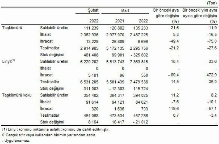 Katı yakıtların satılabilir üretim ve teslimat miktarları, Mart 2022 verilerine şöyle yansıdı: