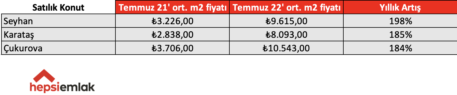 Bu arada Türkiye’nin uzman emlak platformu hepsiemlak'ın Temmuz ayı verilerine göre, satılık konutta geçtiğimiz ay ile karşılaştırıldığında yüzde 17 fiyat artışı ile Adana ilk sırada yer aldı.