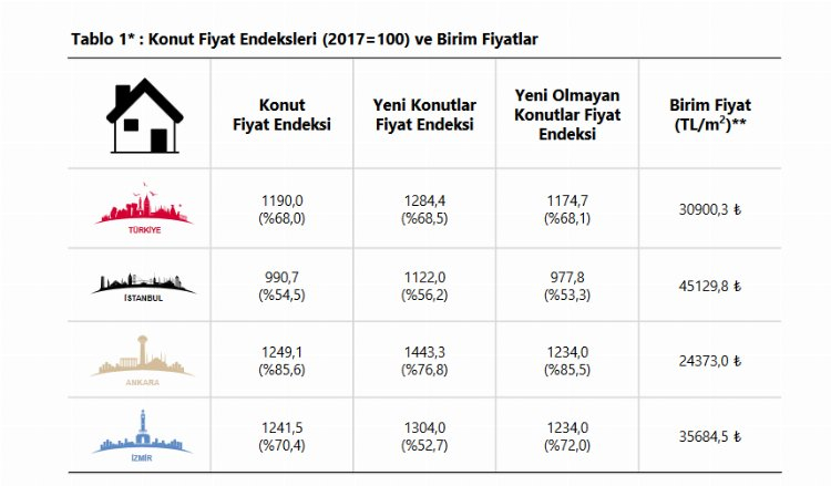 Buna göre üç büyük il için endeks değişiminde bir önceki aya göre İstanbul, Ankara ve İzmir'de sırasıyla yüzde 1,3, 2,4 ve 2,8 artış görüldü.