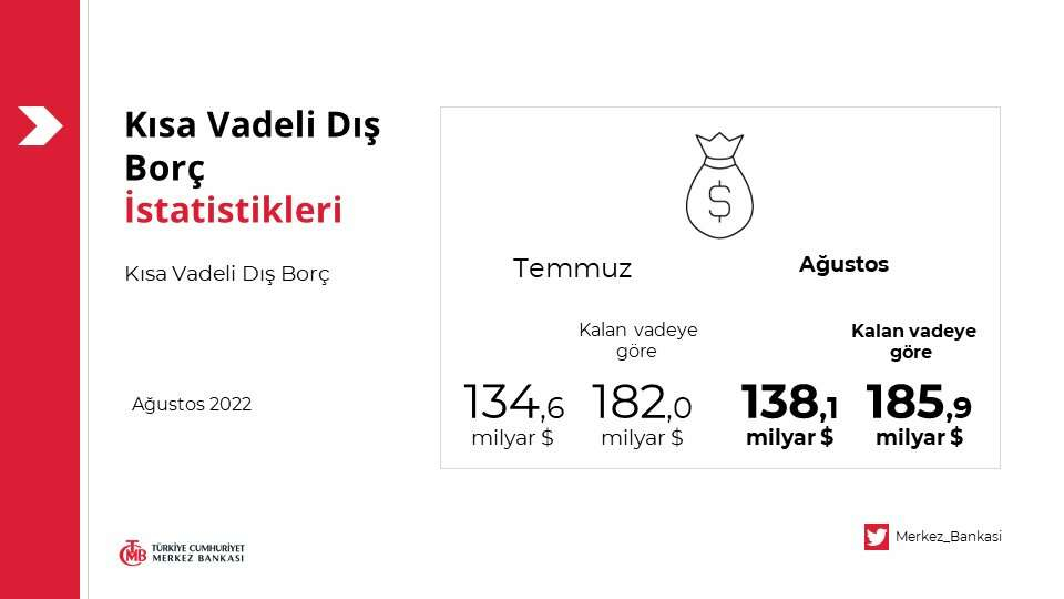 Kısa vadeli dış borç stoku, Ağustos sonu itibarıyla 2021 yıl sonuna göre yüzde 13,6 oranında artışla 138,1 milyar dolar olarak gerçekleşti.