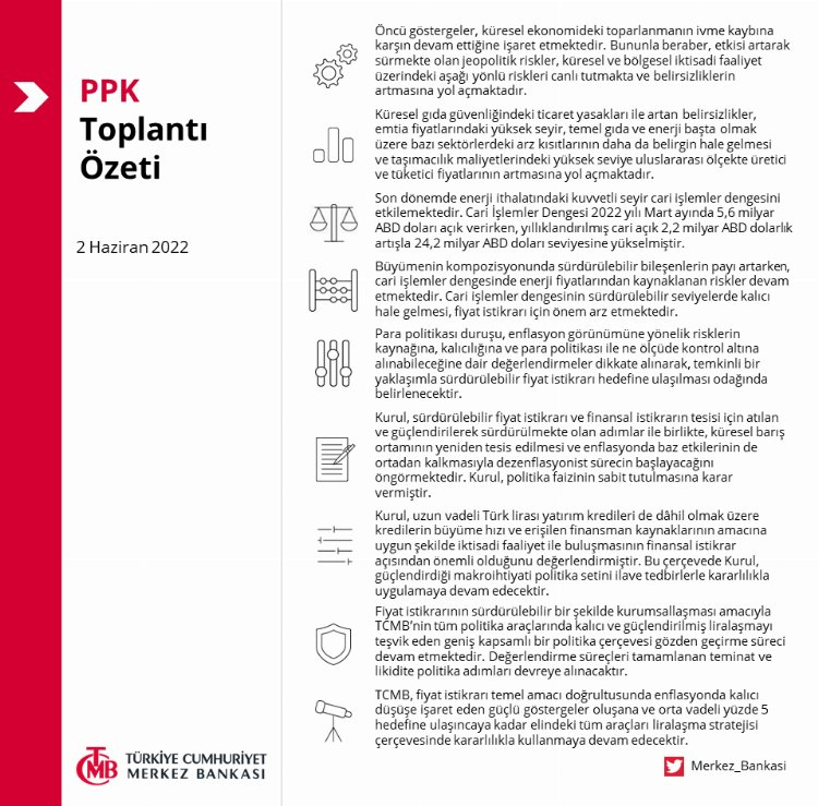 PPK'nın toplantı özetinde, para politikası duruşu, enflasyon görünümüne yönelik risklerin kaynağına, kalıcılığına ve para politikası ile ne ölçüde kontrol altına alınabileceğine dair değerlendirmeler dikkate alındı.