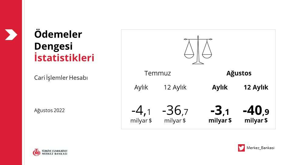 Merkez Bankası'ndan yapılan açıklamada "Bir önceki yılın Ağustos ayında 1.075 milyon ABD doları fazla veren cari işlemler hesabı, bu ayda 3.112 milyon ABD doları açık kaydetmiştir. Bunun sonucunda on iki aylık cari işlemler açığı 40.889 milyon ABD doları olmuştur. Bu gelişmede, ödemeler dengesi tanımlı dış ticaret açığının bir önceki yılın aynı ayına göre 6.816 milyon ABD doları artarak 9.700 milyon ABD dolarına yükselmesi etkili olmuştur" denildi.