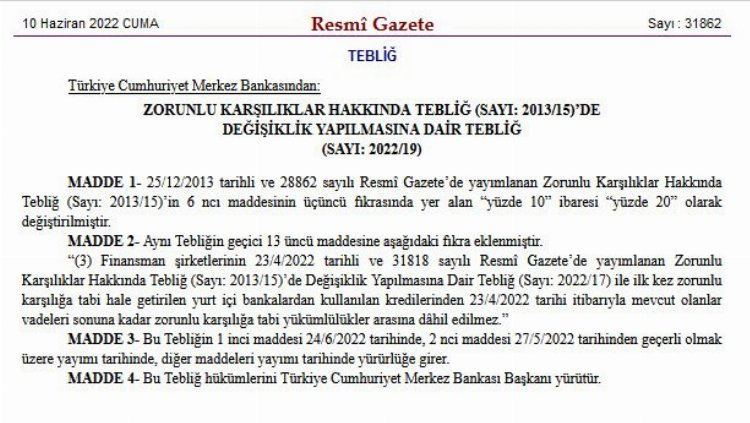 Merkez Bankası, Mayıs ayı sonunda Para Politikası Kurulu metninde değerlendirme süreçleri tamamlanan teminat ve likidite adımlarının 24 Haziran itibariyle devreye alınacağını açıkladı. TL cinsinden ticari nitelikteki kredilere yüzde 10 olarak uygulanan zorunlu karşılık oranı yüzde 20’ye yükseltildi.