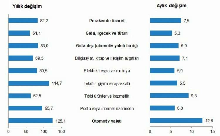 Cari fiyatlarla perakende ciro bir önceki yılın aynı ayına göre yüzde 82,2 arttı. Aynı ayda gıda, içecek ve tütün satışları yüzde 61,1, gıda dışı satışlar (otomotiv yakıtı hariç) yüzde 83,0, otomotiv yakıtı satışları yüzde 125,1 arttı.
