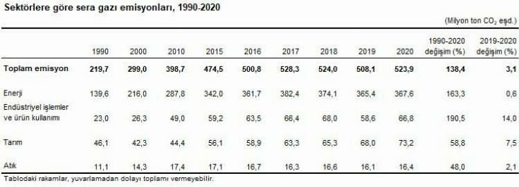 Böylece, 2020'de toplam sera gazı emisyonu bir önceki yıla göre yüzde 3,1 artarak 523,9 milyon ton karbondioksit eşdeğeri oldu.