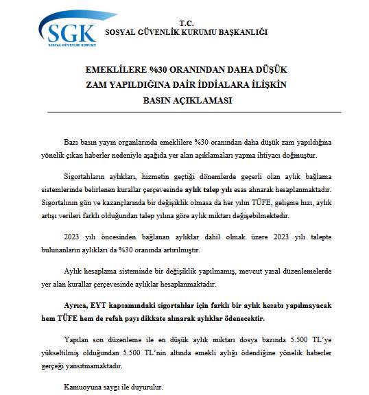 Bazı basın yayın kuruluşundaki söz konusu haberlere ilişkin yazılı açıklama yapan SGK, "2023 yılı öncesinden bağlanan aylıklar dahil olmak üzere 2023 yılı talepte bulunanların aylıkları da yüzde 30 oranında artırılmıştır. Aylık hesaplama sisteminde bir değişiklik yapılmamış, mevcut yasal düzenlemelerde yer alan kurallar çerçevesinde aylıklar hesaplanmaktadır" denildi.