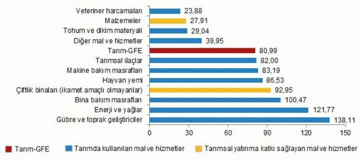 Bir önceki yılın aynı ayına göre göre tarımsal yatırıma katkı sağlayan mal ve hizmet endeksinde yüzde 47,24, tarımda kullanılan mal ve hizmet endeksinde yüzde 86,59 artış gerçekleşti.