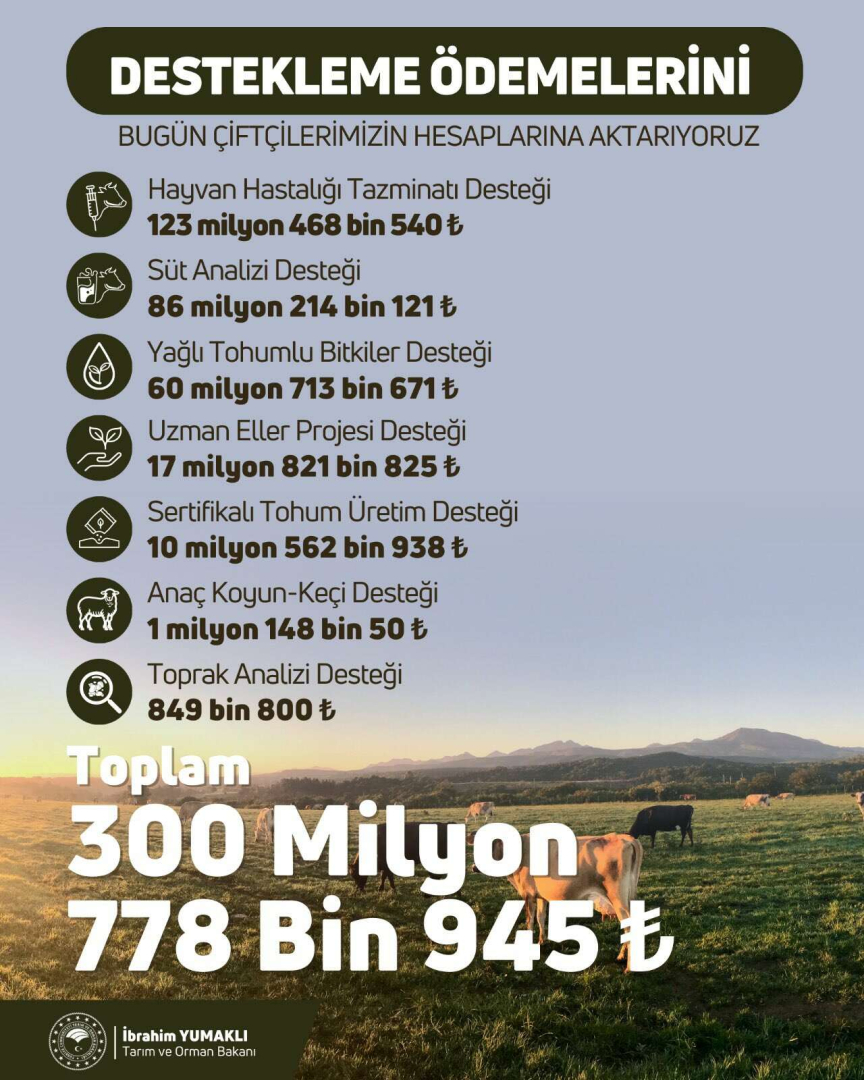 Paylaşımda 300 milyon 778 bin 945 lira olarak destek ödemelerinin detaylı açılımı da yapıldı.
