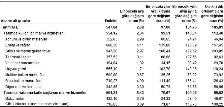 Ana gruplarda tarımda kullanılan mal ve hizmet endeksinde bir önceki aya göre yüzde 2,34, yıllık bazda yüzde 140,04 artış olurken, tarımsal yatırıma katkı sağlayan mal ve hizmet endeksinde bir önceki aya göre yüzde 5,43, bir önceki yılın aynı ayına göre ise yüzde 100,96 artış kaydedildi.