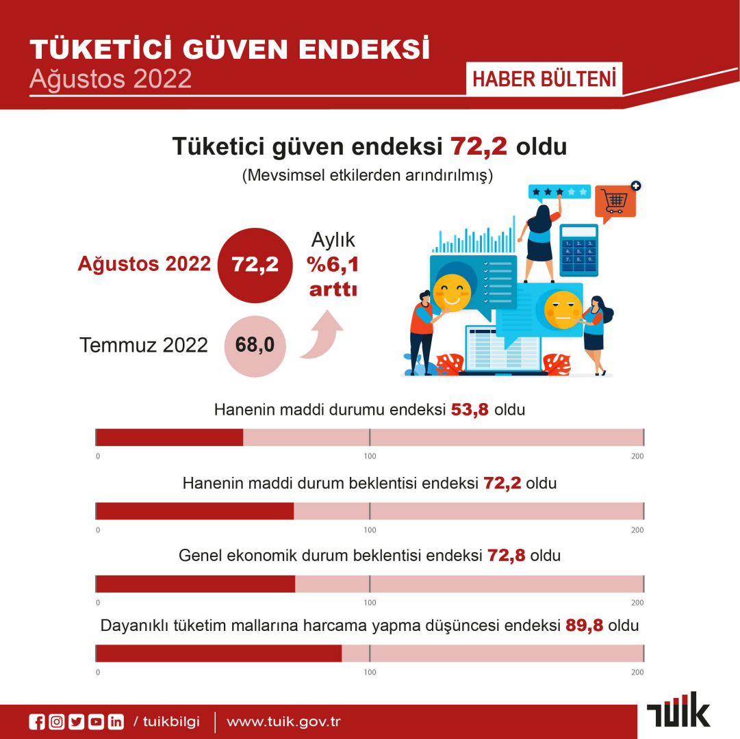 TÜİK ve Türkiye Cumhuriyet Merkez Bankası iş birliğiyle yürütülen "Tüketici Eğilim Anketi" sonuçlarından hesaplanan mevsim etkilerinden arındırılmış tüketici güven endeksi, Ağustos ayında bir önceki aya göre yüzde 6,1 oranında arttı; Temmuz ayında 68,0 olan endeks, Ağustos ayında 72,2 oldu.