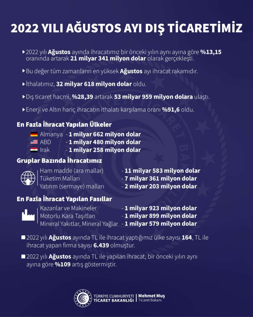Ticaret Bakanı Mehmet Muş, Türkiye'nin Ağustos ayı ihracatı 21 milyar 341 milyon dolar olduğunu açıkladı.