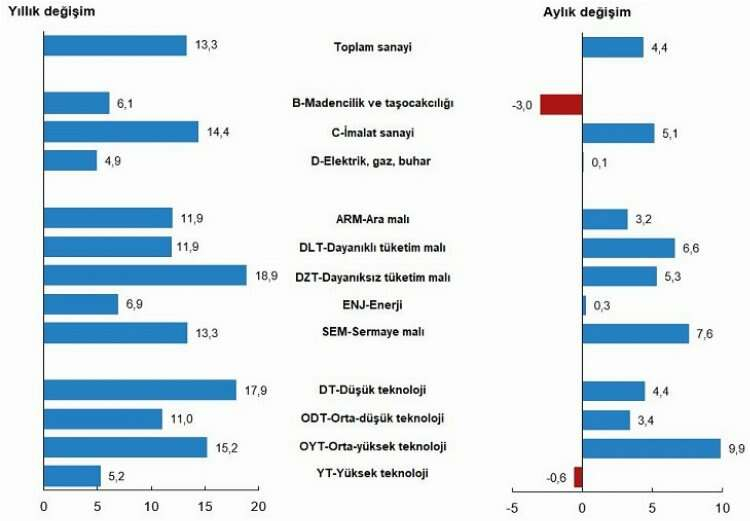 Madencilik ve taşocakçılığı sektörü endeksi bir önceki aya göre yüzde 3,0 azalırken, imalat sanayi sektörü endeksi yüzde 5,1 ve elektrik, gaz, buhar ve iklimlendirme üretimi ve dağıtımı sektörü endeksi yüzde 0,1 arttı.