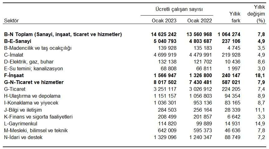 2023 yılı Ocak ayı verilerine göre; sanayi, inşaat ve ticaret-hizmet sektörleri toplamında ücretli çalışan sayısı bir önceki yılın aynı ayına göre yüzde 7,8 arttı. Ücretli çalışan sayısı bir önceki yılın aynı ayında 13 milyon 560 bin 968 kişi iken, 2023 yılı Ocak ayında 14 milyon 625 bin 242 kişi oldu.