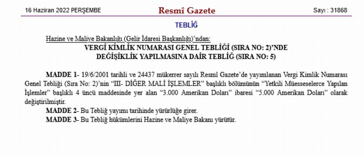 Vergi kimlik numarası tespitini gerektiren tutar sınırı yükseltildi