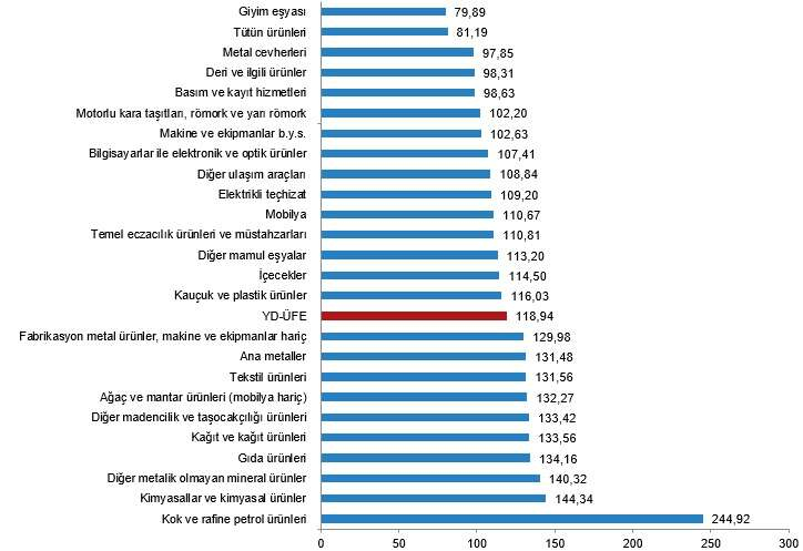 YD-ÜFE sektörlerinden giyim eşyası yüzde 79,89, tütün ürünleri yüzde 81,19, metal cevherleri yüzde 97,85 ile endekslerin en az arttığı alt sektörler oldu.