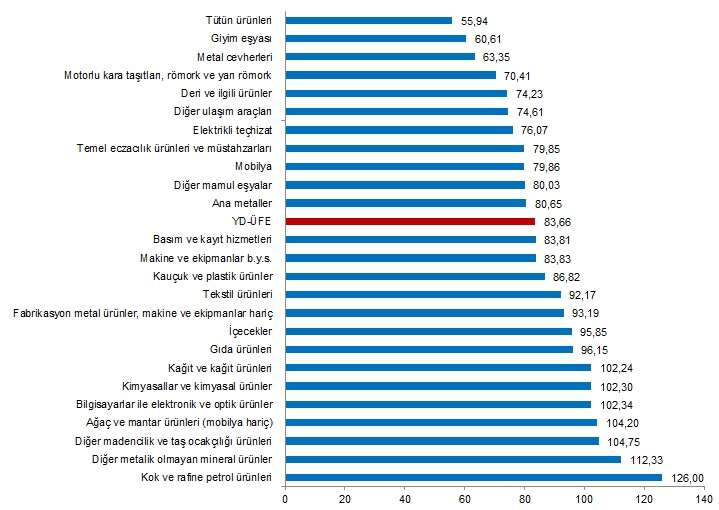Buna göre YD-ÜFE sektörlerinden tütün ürünleri yüzde 55,94, giyim eşyası yüzde 60,61, metal cevherleri yüzde 63,35 ile endekslerin en az arttığı alt sektörler oldu. Buna karşılık kok ve rafine petrol ürünleri yüzde 126, diğer metalik olmayan mineral ürünler yüzde 112,33, diğer madencilik ve taş ocakçılığı ürünleri yüzde 104,75 ile endekslerin en fazla arttığı alt sektörler olarak hesaplandı.