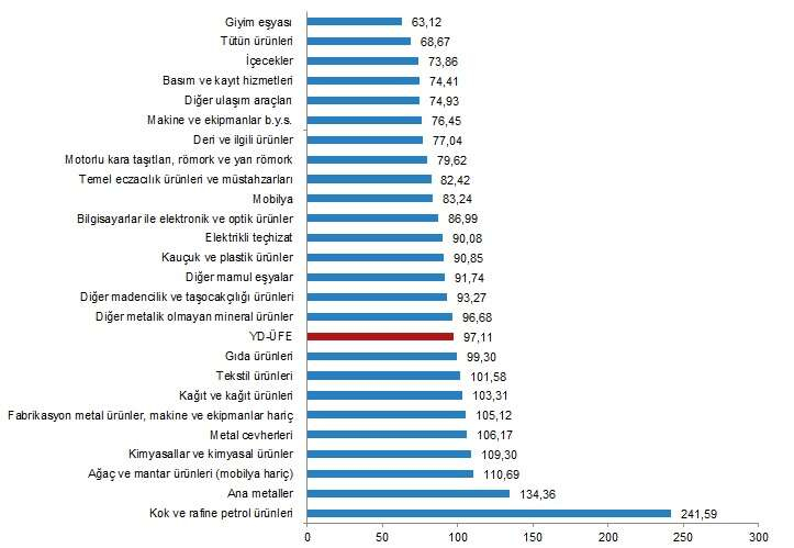 Yıllık YD-ÜFE'ye göre 16 alt sektör daha düşük, 9 alt sektör daha yüksek değişim gösterdi.