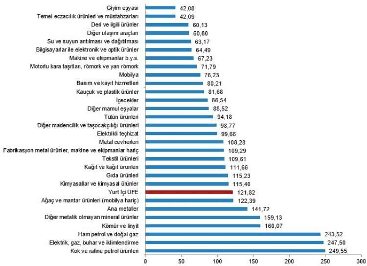 Yıllık en düşük artış; yüzde 42,08 ile giyim eşyası, yüzde 42,09 ile temel eczacılık ürünleri ve müstahzarları, yüzde 60,13 ile deri ve ilgili ürünler alt sektörlerinde gerçekleşti. Buna karşılık kok ve rafine petrol ürünleri yüzde 249,55, elektrik, gaz, buhar ve iklimlendirme yüzde 247,50, ham petrol ve doğal gaz yüzde 243,52 ile endekslerin en fazla arttığı alt sektörler oldu.