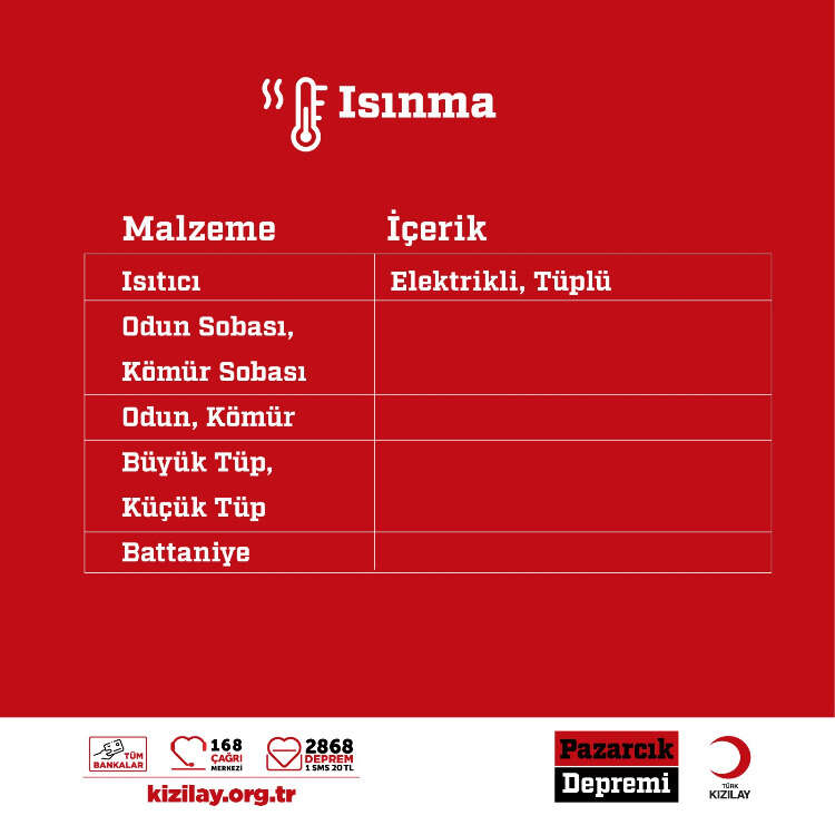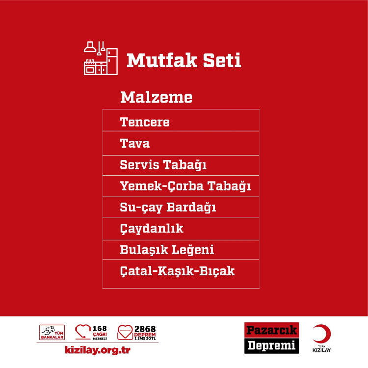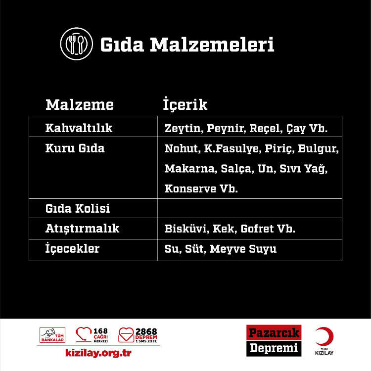 Afetlerde Beslenme Platformunu koordine eden Kızılay, sıcak yemek üretiminde ise kuru gıda malzemeleri ve dağıtımlarda gerekli olan köpük tabak, plastik çatal kaşık setini de en çok ihtiyaç duyulan malzemeler olarak belirledi.