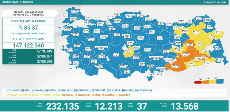 Sağlık Bakanlığı'nın yayımladığı günlük vaka tablosuna göre 37 kişi yaşamını yitirirken, 13 bin 568 kişi sağlığına kavuştu.