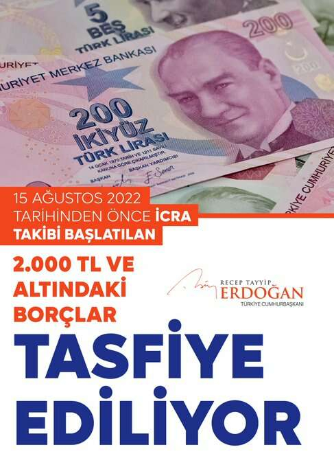 Hükümet olarak bir yandan ülkemizin ihtiyacı olan altyapı ve üstyapı yatırımlarını yaparken diğer yandan refahı artırmak ve artan refahı adil dağıtmak için de çalıştıklarını belirten Cumhurbaşkanı Erdoğan, "Milletimizin can ve mal emniyeti, huzuru, refahı, barış ve güven içinde yaşaması, her vakit olduğu gibi bugün de birinci önceliğimizdir. Bu anlayışla işçilerimizin, emeklilerimizin, memurlarımızın ücretlerinde önemli iyileştirmeler yaptık. Buğday, arpa, çay, fındık, üzüm başta olmak üzere çiftçilerimizin alın terlerinin mahsulü olan tüm ürünlere, hakları olan fiyatları vererek çiftçilerimizi memnun eden adımları attık. Bugün aldığımız yeni bir kararla da vatandaşlarımızın bir kısmının icra takibine uğramasına yol açan 2 bin lira ve altındaki borçlarını tasfiye ediyoruz. Buna göre, 15 Ağustos 2022 tarihinden önce icra takibi başlatılmış 2 bin lira ve altındaki alacakların gider gösterilerek vergiden düşürülebilmesini ve böylece tasfiyesini sağlıyoruz. Varlık yönetim şirketlerine devredilmiş alacaklar da buna dâhildir. Böylece icra takibine konu yaklaşık 10 milyon dosya ve yaklaşık 5,5 milyon vatandaşımız, icra takibinden kurtulmuş olacaktır" diye konuştu.