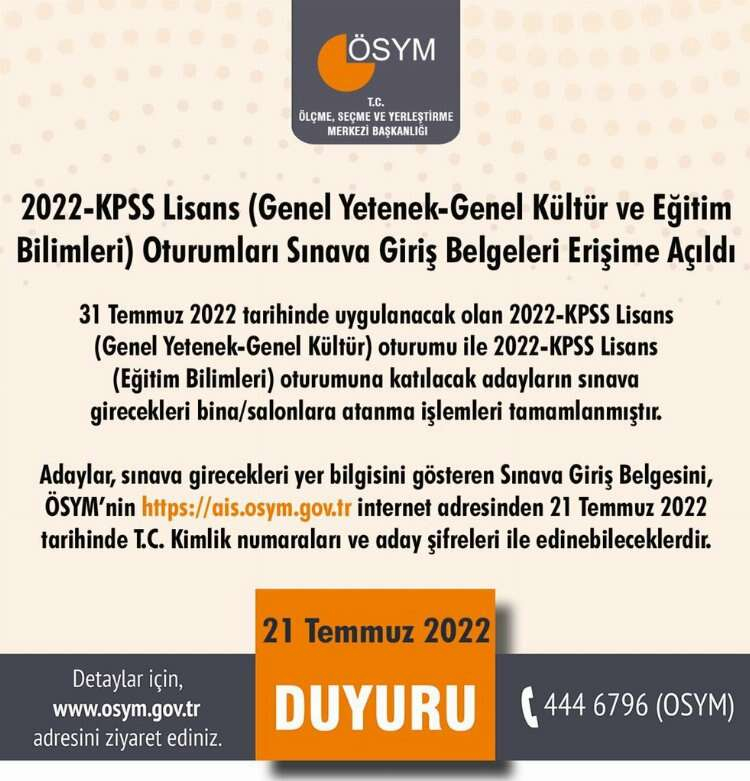ANKARA (İGFA) - ÖSYM Başkanlığı, 2022-KPSS Lisans (Genel Yetenek-Genel Kültür ve Eğitim Bilimleri) Oturumları Sınava Giriş Belgelerinin erişime açıldığını duyurdu.
