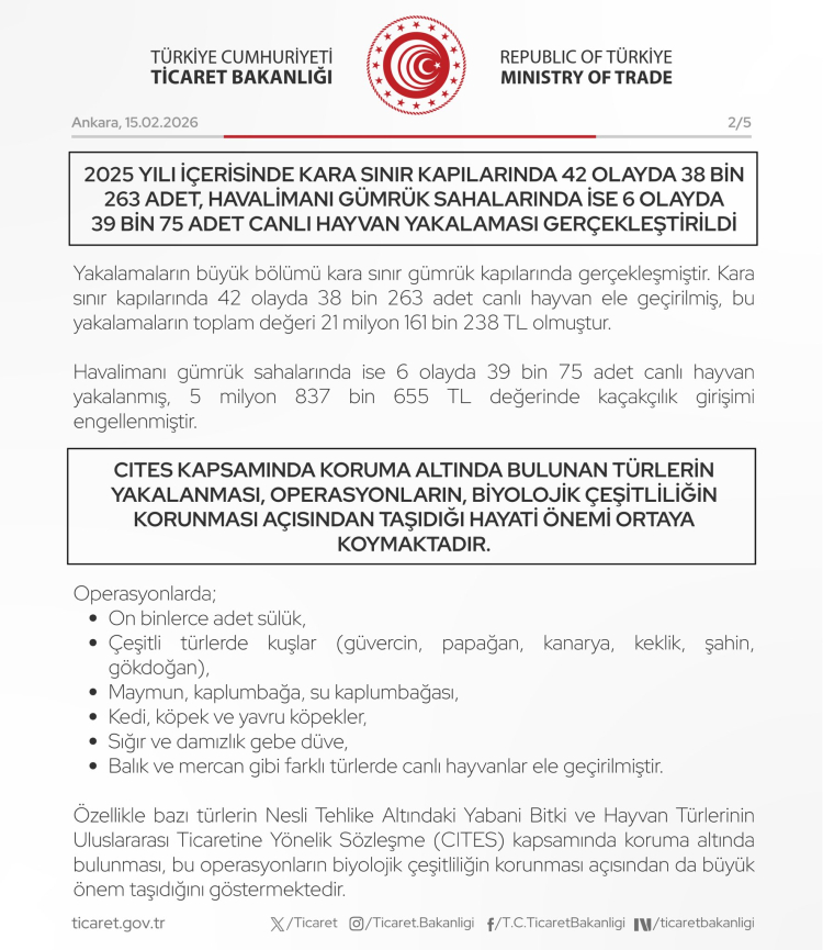 Yakalanan türler arasında, CITES (Nesli Tehlike Altındaki Yabani Bitki ve Hayvan Türlerinin Uluslararası Ticaretine İlişkin Sözleşme) kapsamında koruma altında bulunan canlıların da yer aldığı belirtildi. Bakanlık, bu operasyonların yalnızca kaçakçılıkla mücadele değil, aynı zamanda biyolojik çeşitliliğin korunması açısından da hayati önem taşıdığına dikkat çekti.