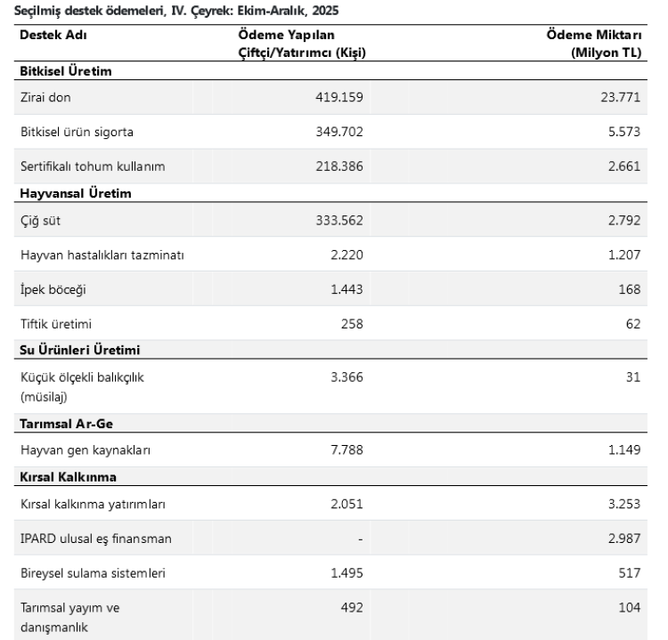 ANKARA (İGFA) - 2025 yılı tarımsal destek ödemeleri “IV. Çeyrek ve Yıllık: Ekim-Aralık” verileriyle netleşti.