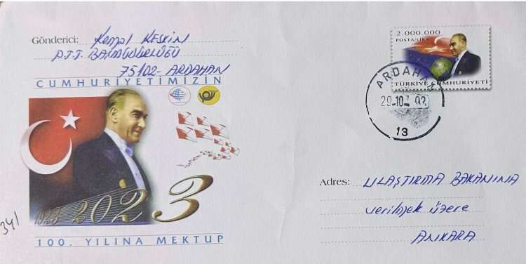ANKARA (İGFA) - İki çocuk babası olan PTT çalışanı Kemal Keskin, 21 yıl önce geleceğe bir anı bırakmak ve mektup kavramını toplumda canlı tutmak amacıyla PTT tarafından hayata geçirilen, "2023'e Cumhuriyetimizin 100üncü Yılına Mektup Kampanyası kapsamında Ulaştırma ve Altyapı Bakanlığı makamına mektup yazdı.
