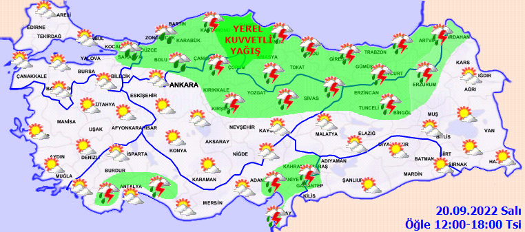 Meteoroloji'den alınan bilgiye göre, İç Anadolu’nun kuzeydoğusu, Karadeniz ile Kocaeli, Sakarya, Antalya’nın iç kesimleri, Osmaniye, Hatay kıyıları, Kahramanmaraş, Gaziantep, Erzincan, Erzurum, Tunceli, Bingöl ve Ardahan çevrelerinin yerel olmak üzere sağanak ve gök gürültülü sağanak yağışlı geçecek.