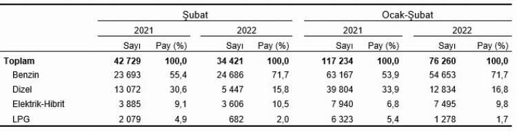 Şubat ayında trafiğe kaydı yapılan taşıtların yüzde 51,7'sini otomobil, yüzde 21,7'sini motosiklet, yüzde 15,7'sini kamyonet, yüzde 5,9'unu traktör, yüzde 3,6'sını kamyon, yüzde 0,6'sını minibüs, yüzde 0,5'ini otobüs ve yüzde 0,3'ünü özel amaçlı taşıtlar oluşturdu.