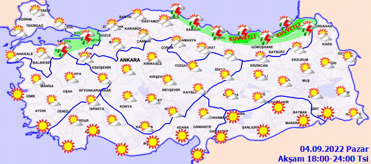 Meteoroloji Genel Müdürlüğü tarafından yapılan son değerlendirmelere göre: Ülkemizin kuzey kesimlerinin parçalı ve yer yer çok bulutlu, Marmara’nın doğusu, Batı Karadeniz, Orta ve Doğu Karadeniz kıyıları ile Ardahan çevrelerinin yerel sağanak ve gök gürültülü sağanak yağışlı, diğer yerlerin az bulutlu ve açık geçeceği tahmin ediliyor. Yağışların; Batı ve Doğu Karadeniz kıyıları, Kocaeli çevreleri ile Sakarya’nın kuzey ilçelerinde kuvvetli, Trabzon’un doğu ilçeleri, Rize ve Artvin kıyılarında çok kuvvetli ve şiddetli olması bekleniyor.