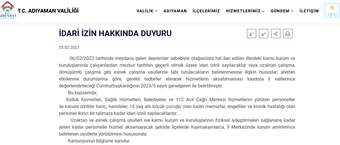 ADIYAMAN (İGFA) - İdari İzin duyurusu, Adıyaman Valiliği'nin internet sitesinden yapıldı.