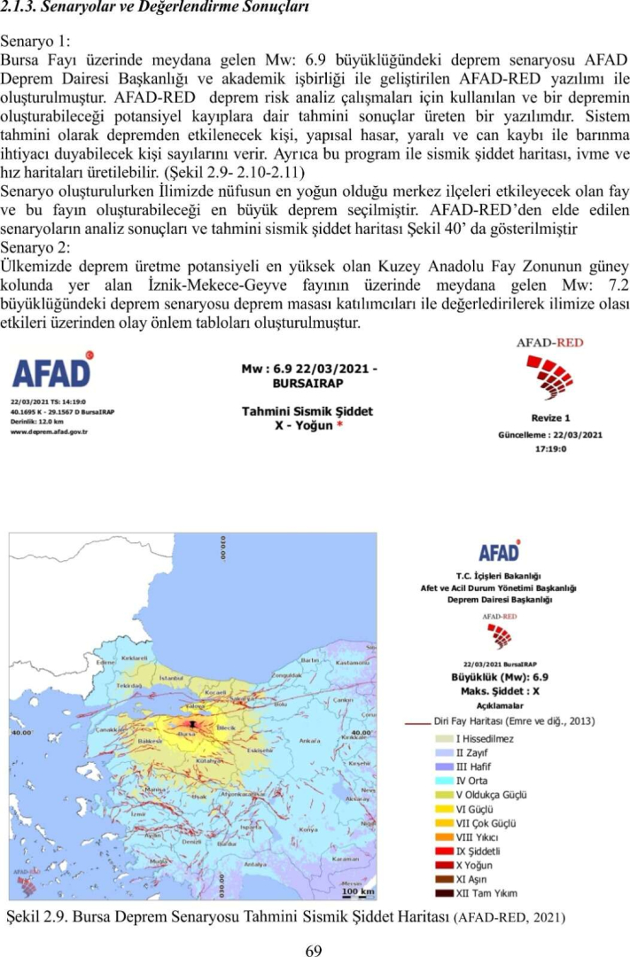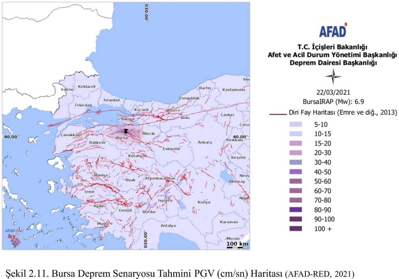 Bursa Fayı üzerinde meydana gelen Mw: 6.9 büyüklüğündeki deprem senaryosu AFAD Deprem Dairesi Başkanlığı ve akademik işbirliği ile geliştirilen AFAD-RED yazılımı ile oluşturulmuştur. AFAD-RED deprem risk analiz çalışmaları için kullanılan ve bir depremin oluşturabileceği potansiyel kayıplara dair tahmini sonuçlar üreten bir yazılımdır. Sistem tahmini olarak depremden etkilenecek kişi, yapısal hasar, yaralı ve can kaybı ile barınma ihtiyacı duyabilecek kişi sayılarını verir. Ayrıca bu program ile sismik şiddet haritası, ivme ve hız haritaları üretilebilir. (Şekil 2.9- 2.10-2.11)