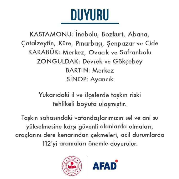 Bartın, Bolu, Çankırı, Düzce, Karabük, Kastamonu, Samsun, Sakarya, Sinop ve Zonguldak’ta İl AFAD Merkezleri, yaşanabilecek olumsuzluklara karşı, ilgili afet gruplarının katılımı ile toplandığı kaydedilen açıklamada il il çalışmalar aktarıldı.