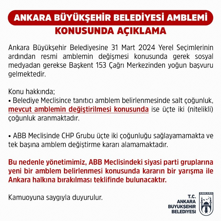 Konuyla ilgili Belediye Meclisi'nce tanıtıcı amblem belirlenmesinde salt çoğunluğun mevcut amblemin değiştirilmesi konusunda ise üçte iki (nitelikli) çoğunluk arandığı anımsatılarak, Ankara Büyükşehir Belediye Meclisi'nde CHP Grubu'nun 3'te 2 çoğunluğu sağlayamadığı ve tek başına amblem değiştirme kararı alamadığı vurgulandı. Belediyeden yapılan yazılı açıklamada, "Bu nedenle yönetimimiz, Ankara Büyükşehir Belediye Meclisi'ndeki siyasi parti gruplarına yeni bir amblem belirlenmesi konusunda kararın bir yarışma ile Ankara halkına bırakılması teklifinde bulunacaktır" denildi.