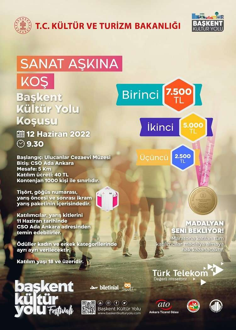 18 yaşını doldurmuş tüm kulüplü, ferdi ve yabancı uyruklu sporcuların katılabileceği Başkent Kültür Yolu Koşusu, Türkiye Atletizm Federasyonu ve WA yarışma kurallarına uygun olarak yapılacak. Amatör ve profesyonel atletlerin katılabileceği etkinlikte birinciye 7.500 TL, ikinciye 5.000 TL, üçüncüye ise 2.500 TL ödül verilecek. Koşuya katılan tüm sporcular madalya almaya hak kazanacak. Ulucanlar Müzesi’nden başlayıp tüm rotayı takip ederek CSO ADA ANKARA’da sona eren Başkent Kültür Yolu Koşusu, 1,5 saat sürecek. Başkent Kültür Yolu Koşusu’snun biletleri biletinial.com üzerinden temin edilebiliyor.