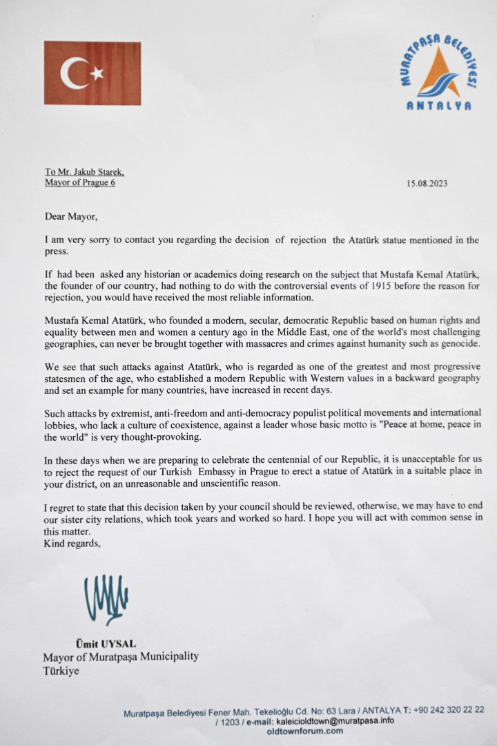 Antalya Muratpaşa Belediye Başkanı Ümit Uysal, Prag Büyükelçiliğinin Türkiye Cumhuriyeti’nin 100’üncü yılı dolayısıyla bir parka Atatürk heykeli koyma talebini reddeden kardeş kenti Prag altıncı bölgesine mektup yazdı.