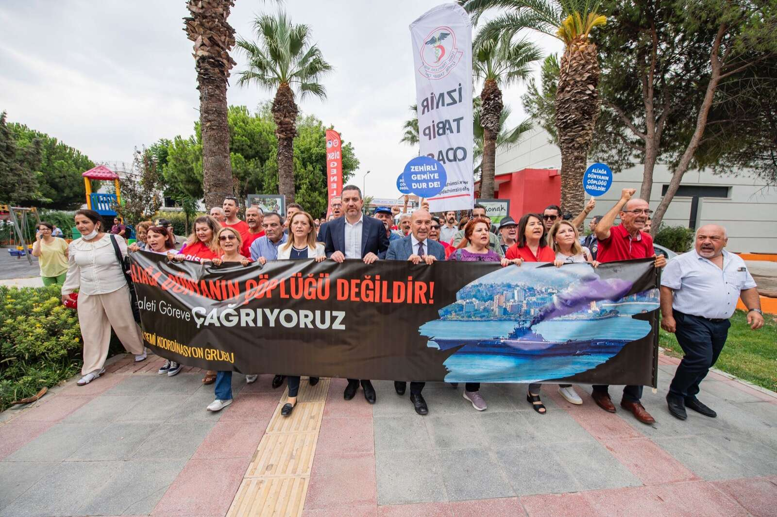 Gösterilen çevre duyarlılığına vurgu yapan İzmir Büyükşehir Belediye Başkanı Tunç Soyer, İzmir'e hep birlikte sahip çıkmanın gururunu yaşadığını belirterek, "Biz ölüm gemisi diyoruz, toksik gemi diyoruz ama düzeltmeye ihtiyaç var aslında. Gelen gemi falan değil. Gemi olma özelliğini tamamen yitirmiş bir kargo geliyor. Zehir, çöp kargosu... Gelen binlerce tonluk bir çöp, zehir. Öncelikle bunu anlamamız lazım" diye konuştu.
