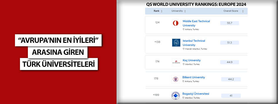 İngiltere merkezli yükseköğretim derecelendirme kuruluşu QS tarafından bu yıl ilk kez yapılan Avrupa Konseyine üye ülkelerin üniversitelerinin değerlendirildiği “Dünya Üniversite Sıralaması: Avrupa 2024"te ODTÜ, İTÜ, Koç, Bilkent ve Boğaziçi üniversiteleri ilk 200'e girdi