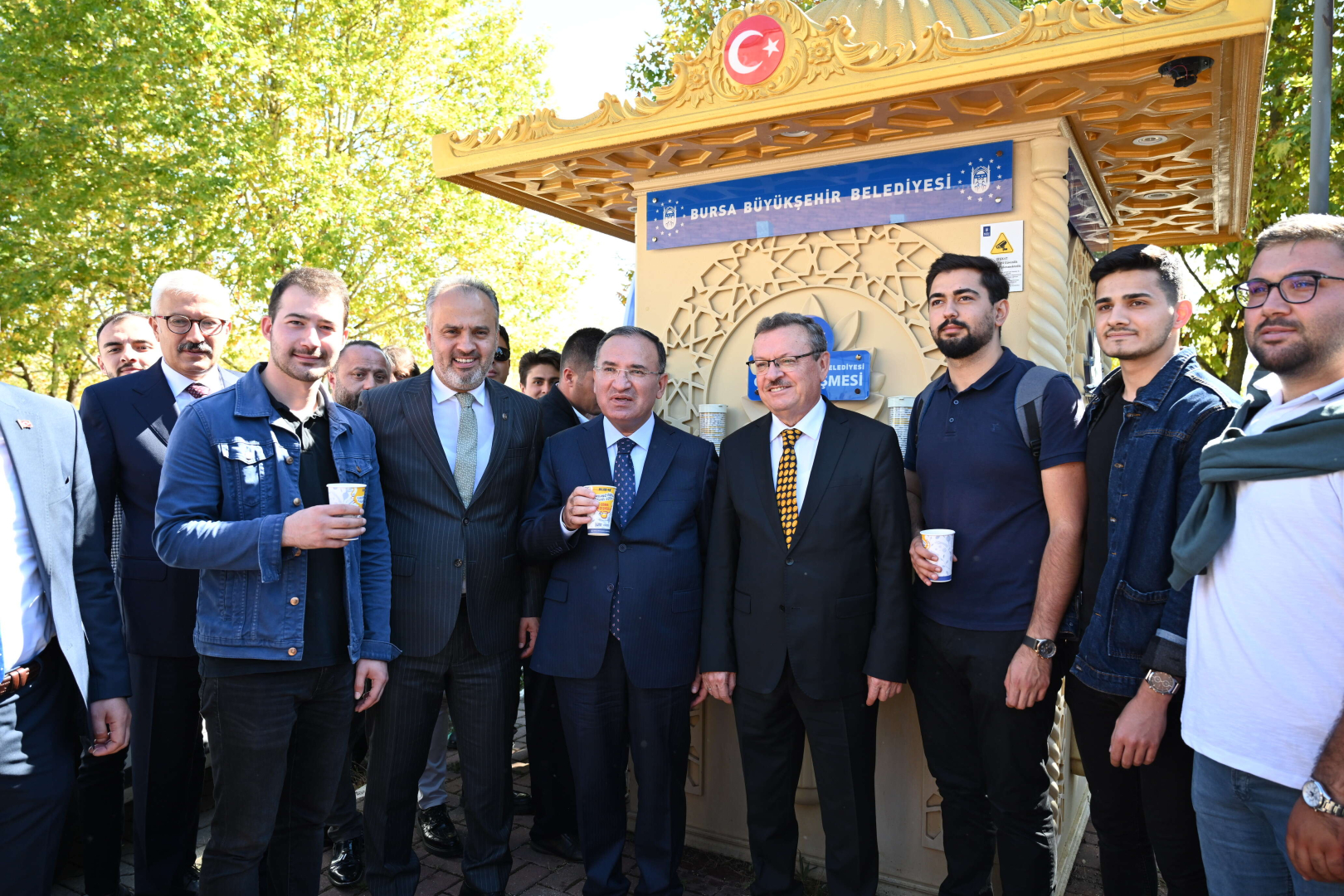 Adalet Bakanı Bekir Bozdağ, Uludağ Üniversitesi akademik yıl açılış töreni için geldiği Bursa’da ‘Büyükşehir Belediyesi tarafından kampüs içerisinde üniversiteli gençler için kurulan’ çorba çeşmesinden çorba içti.