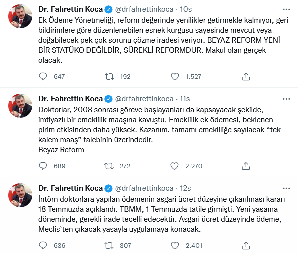 Bakan Koca, ayrıca "Beyaz Reform" etiketiyle yaptığı paylaşımda ise, "Doktorlar, 2008 sonrası göreve başlayanları da kapsayacak şekilde, imtiyazlı bir emeklilik maaşına kavuştu. Emeklilik ek ödemesi, beklenen pirim etkisinden daha yüksek. Kazanım, tamamı emekliliğe sayılacak 'tek kalem maaş' talebinin üzerindedir" notunu iletti.